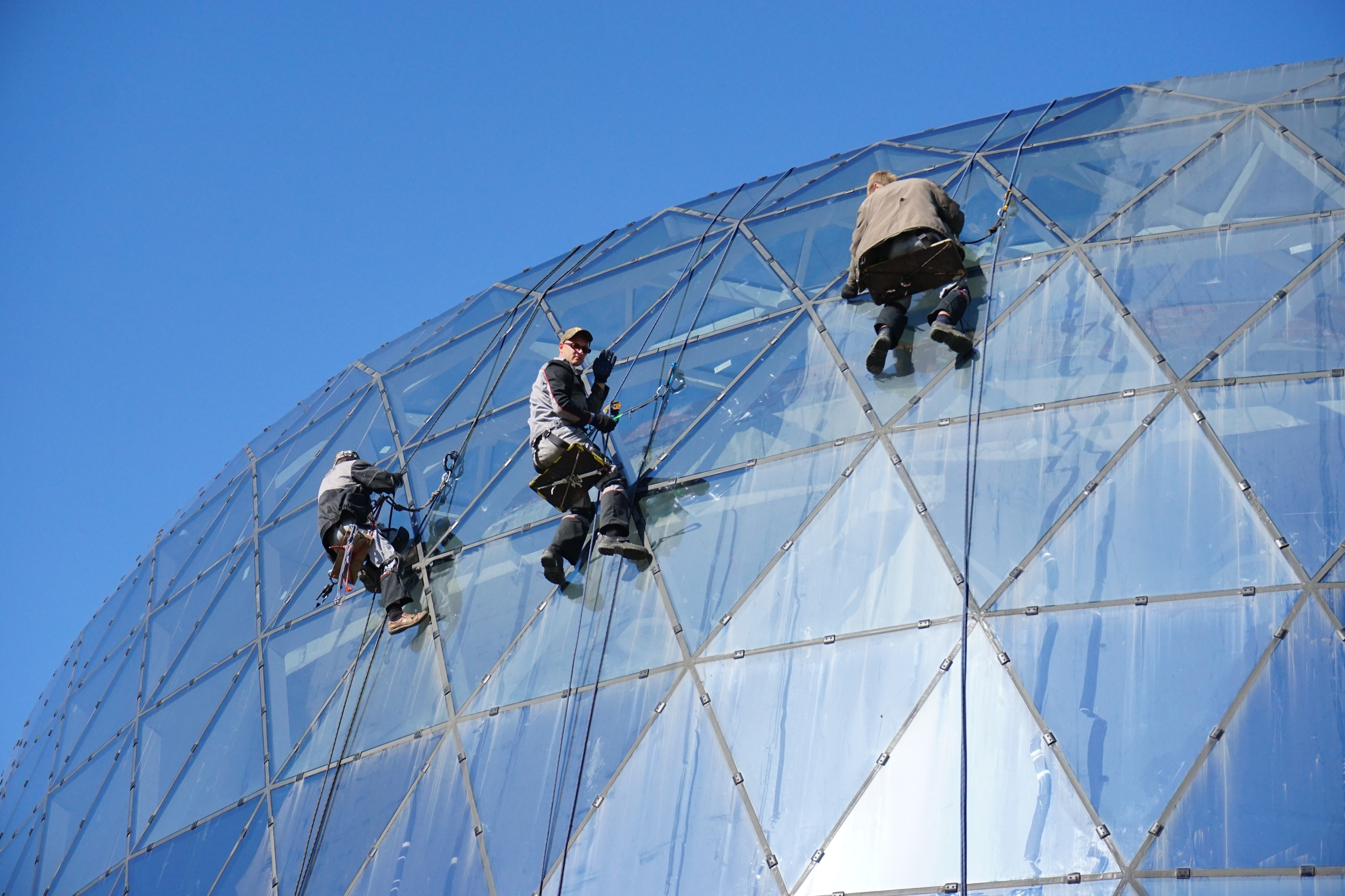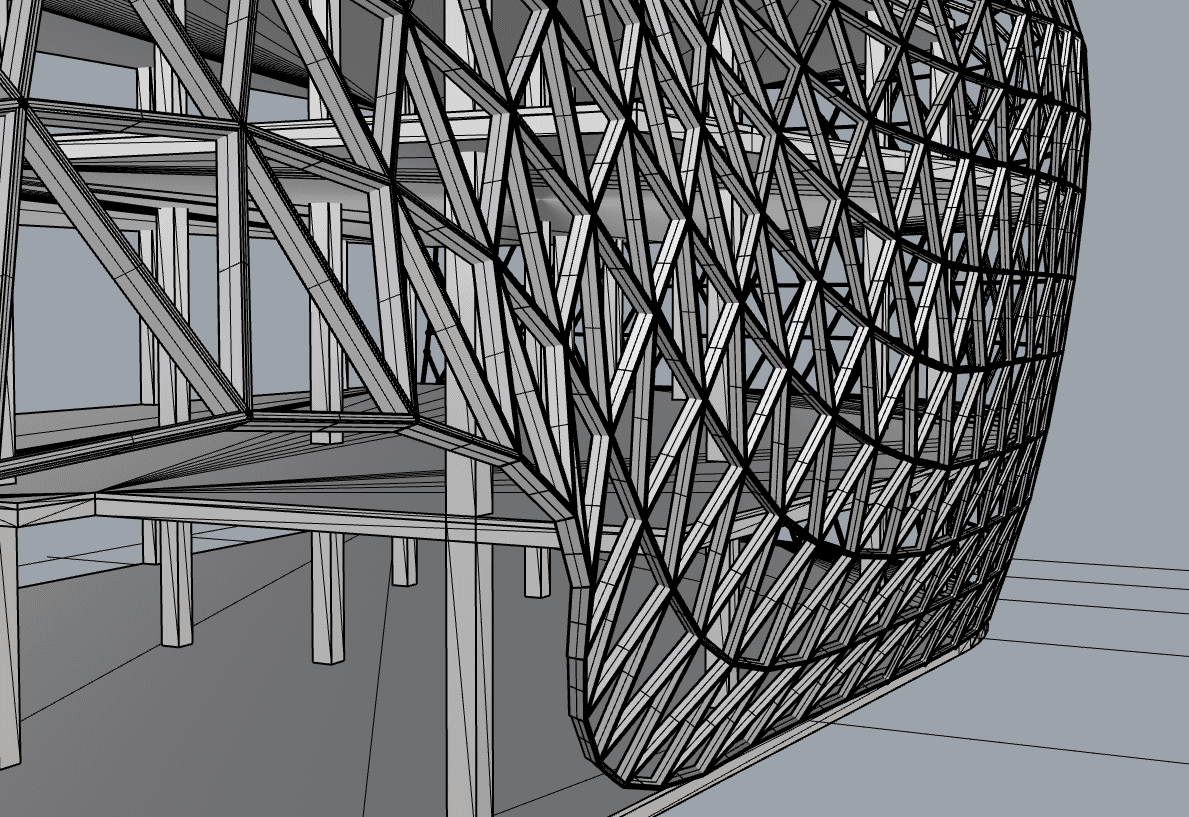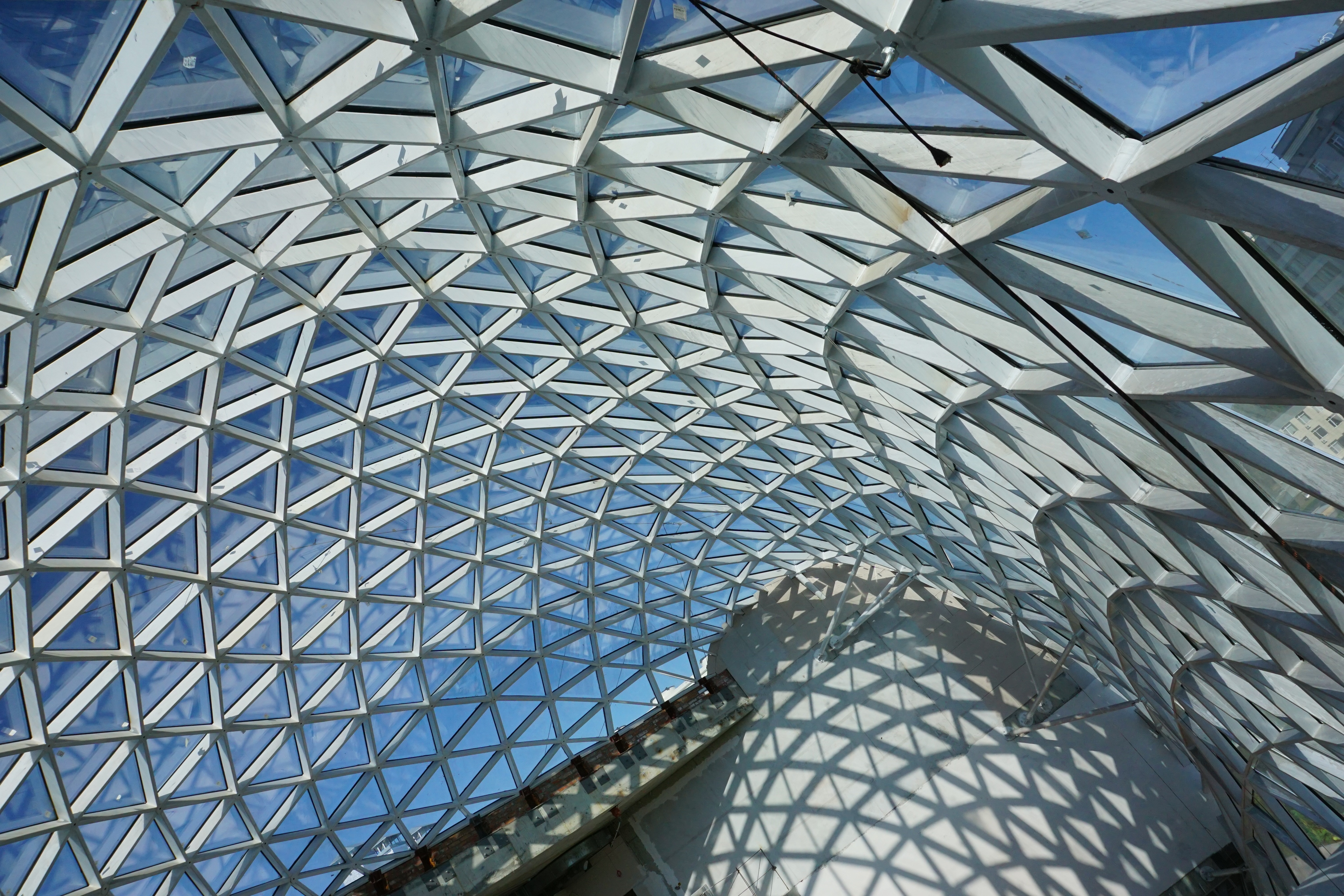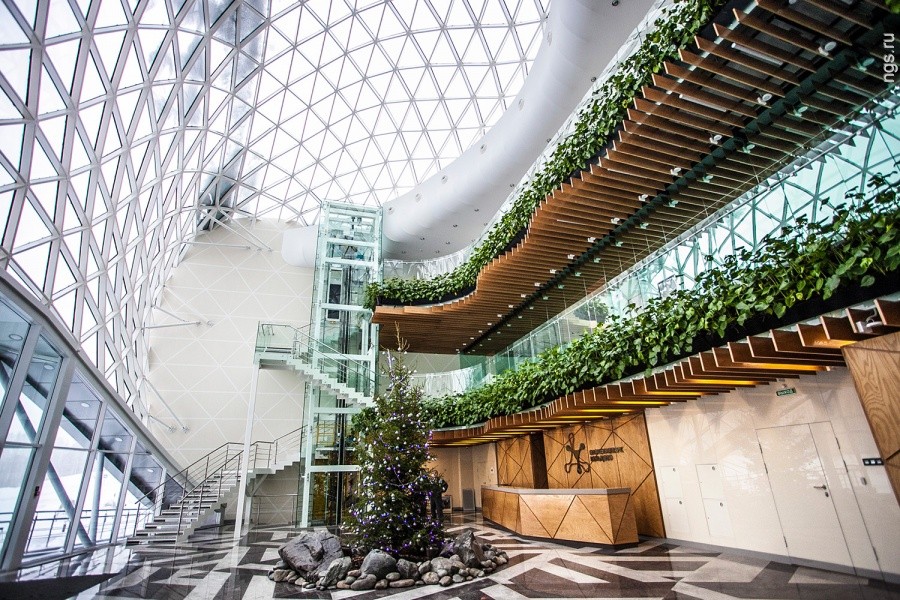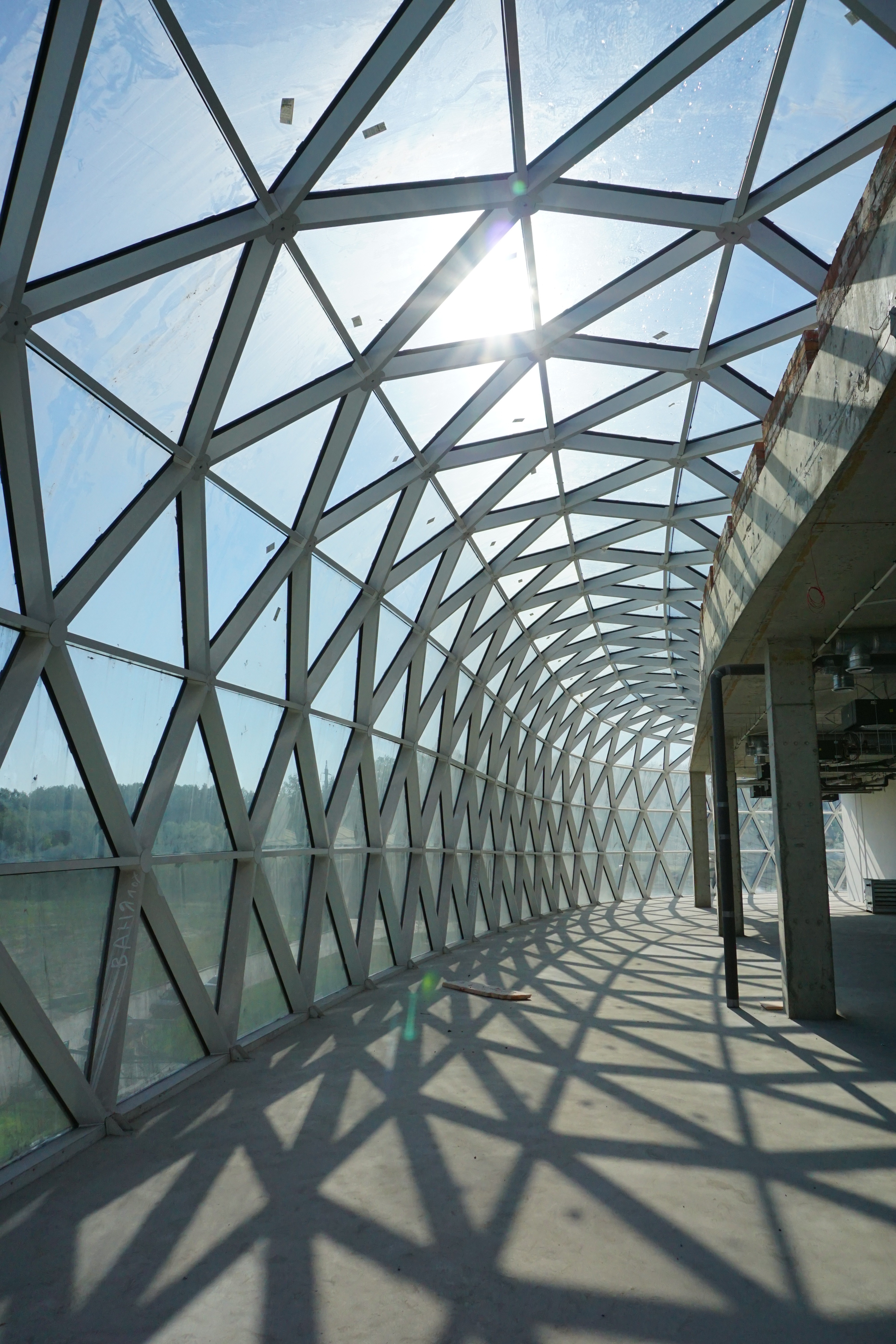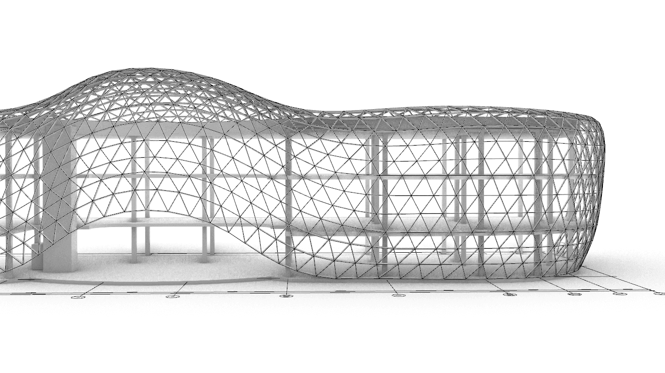 Стеклянный фасад в форме гусеницы перетекает в купол над атриумом. Фасад представляет собой сетчатую конструкцию по нашей запатентованной технологии: цилиндрическая узловая система, однослойная конструкция на треугольной геометрической поверхности. Каждый блок состоит из алюминиевого (или стального) цилиндра и профилированной алюминиевой (или стальной) трубы.